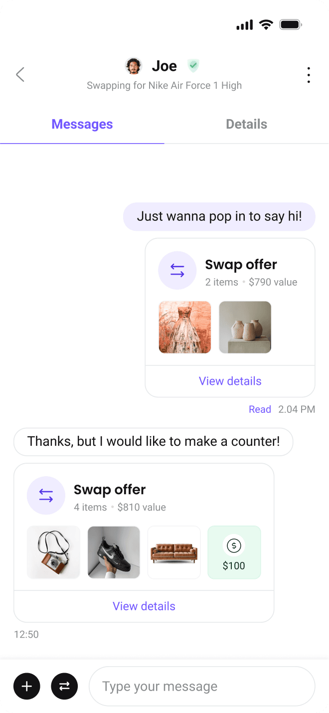 Once an offer is accepted, chat to finalize the details and complete the swap smoothly.