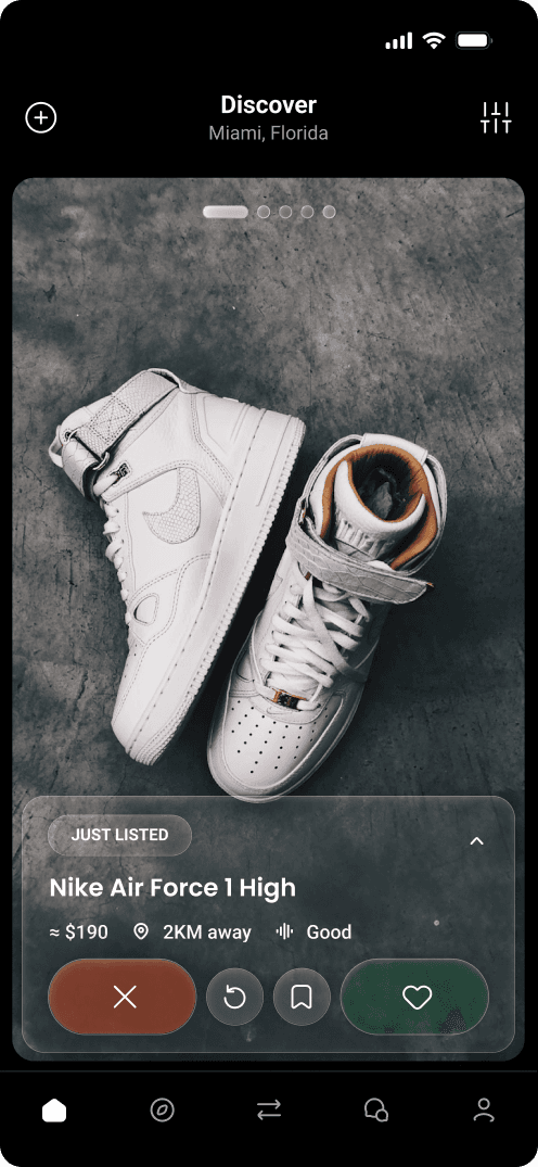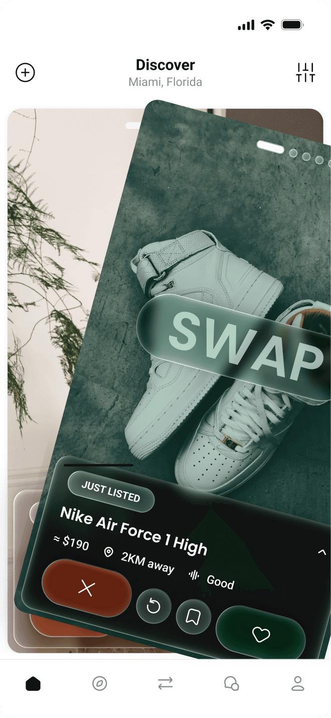 Explore items available for swap. Swipe to pass or show interest when something catches your eye.